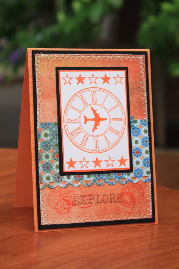 I just kept playing until I had all the colours! I used the Basic Grey Marrakech PP as they have the most beautiful oranges and blues. I was a little stumped on the beige so I sewed the edges with beige thread! The Teresa Collins plane stamp I bought for my Thailand travel album (a work in progress!)